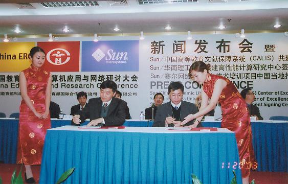 下午2点,大会主办方之一SUN公司举行新闻发布会,与赛尔网络、华南理工大学、CALIC三方现场签署了一系列合作协议。教育部科技司秦正先生、高教司葛道凯副司长出席了协议签字仪式。