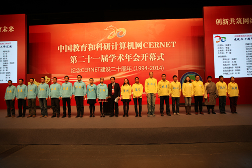 2014年11月25日,中国教育和科研计算机网CERNET第二十一届学术年会在京召开。在今天的开幕式上,十八所高校的CERNET运行管理者别开生面地介绍了CERNET二十年的建设情况,与会的1500多名高校科研人员在一幅幅历史影像中,重温了CERNET20年的建设历史。今年时值互联网进入中国二十周年,也是中国第一个全国性互联网中国教育和科研计算机网CERNET建设二十周年。