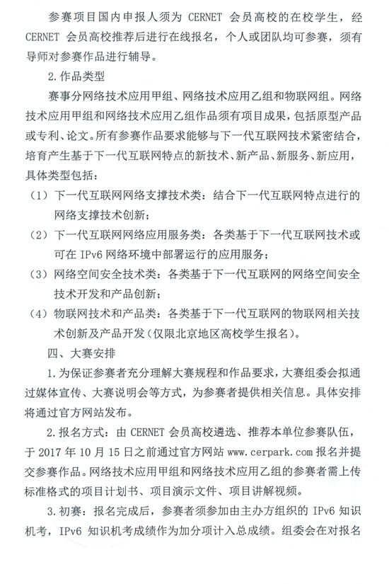 2.报名方式:由CERNET会员高校遴选、推荐本单位参赛队伍,于2017年10月15日之前通过官方网站www.cerpark.com报名并提交参赛作品。网络技术应用甲组和网络技术应用乙组的参赛者需上传标准格式的项目计划书、项目演示文件、项目讲解视频。