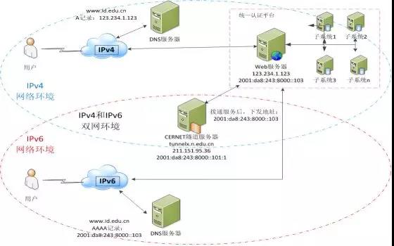 对于中型统一认证类网站部署于IPv4环境下:在网络层,域名有AAAA解析记录,指向web服务器的IPv6地址;在中间层,使用CERNET隧道服务,拨通服务并获得下发的IPv6地址,修改tomcat的配置,使得tomcat服务可启动在IPv6的80端口上。为使处于IPv6环境下的用户能够正常访问该网站,使用隧道服务对该网站进行升级改造。具体方案流程如下: