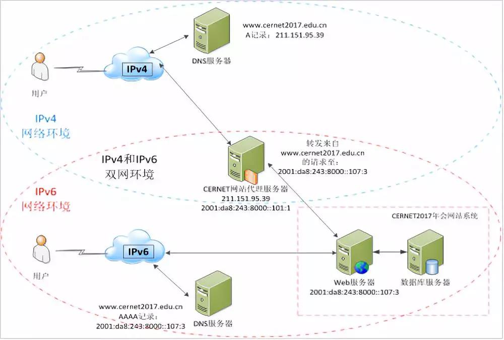 CERNET2017年会网站是中国教育和科研计算机网学术年会的在线官方网站,部署于IPv6环境下。在网络层,机房接入CERNET2,web服务器有IPv6地址;域名www.cernet2017.edu.cn有AAAA解析记录,指向web服务器。在中间层,修改Apache的配置,使得apache服务启动在IPv6的80端口上。