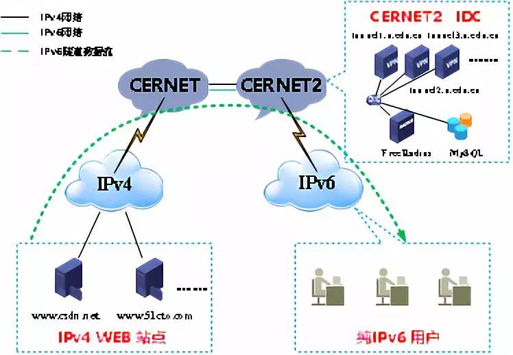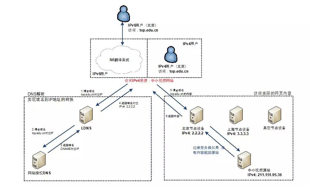 对于中小视频网站部署于IPv6环境下:机房接入CERNET2,web服务器有IPv6地址;域名有AAAA解析记录,指向web服务器;处于IPv6环境下的用户可正常访问。为使处于IPv4环境下用户正常访问该网站,可部署IVI设备,使下联用户获取到IPv6地址,并通过IPv4带宽访问IPv6资源。