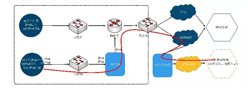 很多中小视频网站部署在IPv4环境下,可通过部署IVI设备进行升级改造,以使IVI设备下联用户能够获取到IPv6和IPv4地址,能够访问IPv6资源,并通过IPv6带宽访问IPv4资源。