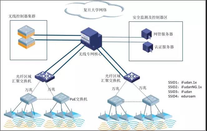 该项目的实施,不仅提高了复旦大学无线网络覆盖率,也使学校信息化基础建设迈向新的台阶:一是实现了复旦大学四个校区无线网络架构的统一,每校区分别部署2台集群式核心,通过OSPF实现校区间三层互联,无线网络采用网关部署在核心的二层组网模式,易于维护管理;二是AC旁挂核心,采用隧道模式转发,实现无线终端流量的统一监控管理;三是接入-汇聚-核心在非上联端口均开启端口隔离功能,减小广播域的同时,提高了网络的健壮性。