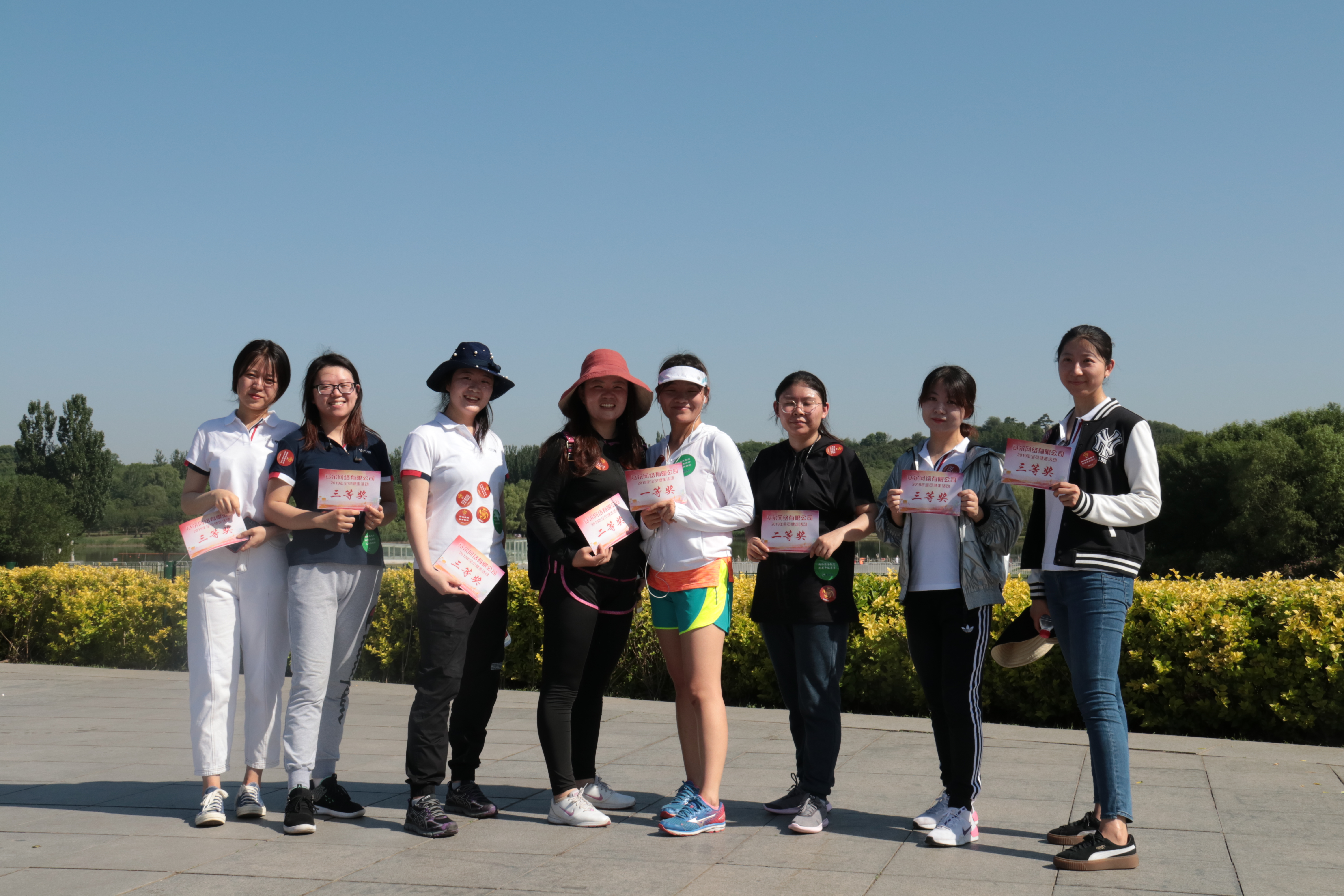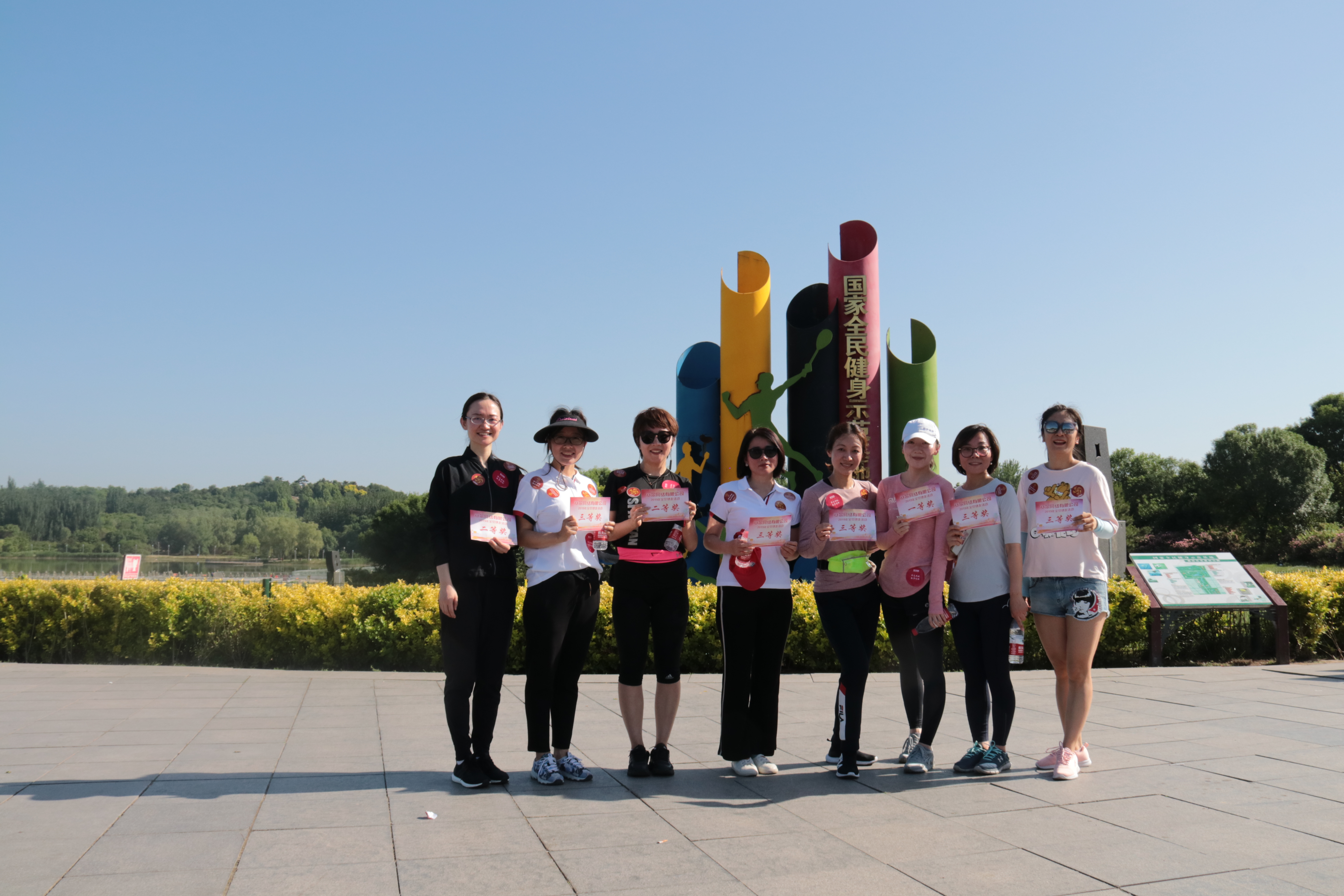 活动当天,北京总部选择了奥森公园5公里的赛程进行健走比赛,参赛者根据年龄和性别分为芳华(中年女子)、荣耀(中年男子)、飞扬(青年女子)和凌云(青年男子)四支队伍。遵循历年赛制,参赛队员从起点出发、途径三处服务站,分别集齐印有公司LOGO、核心价值观、使命和愿景的四张标识贴后,方完成比赛全程。四组参赛队伍每组设一等奖1名,二等奖2名,三等奖5名。