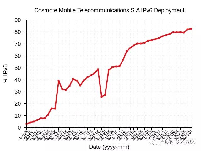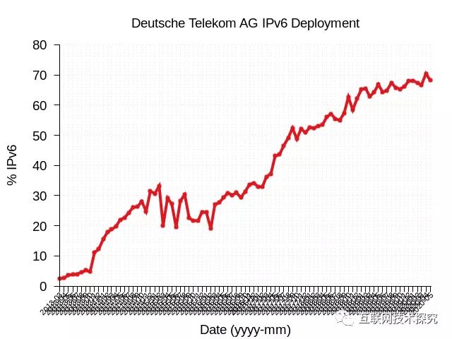 欧洲方面,Cosmote是希腊最大的移动运营商,用户达到了790万,图5显示它在2016年开始启用IPv6,在4年内将IPv6部署率提升到了80%。德国电信运营商Deutsche Telekom AG,在7年时间内将IPv6部署率提升到了70%(图6)。