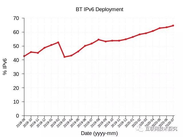 图13显示BT从2018年开始支持IPv6,两年时间内IPv6部署率从40%升至80%。英国天空广播公司在2016年初短短的5个月内就开启了IPv6端到端(从互联网到用户)服务,IPv6部署率从10%飙升到了70%(图14)。