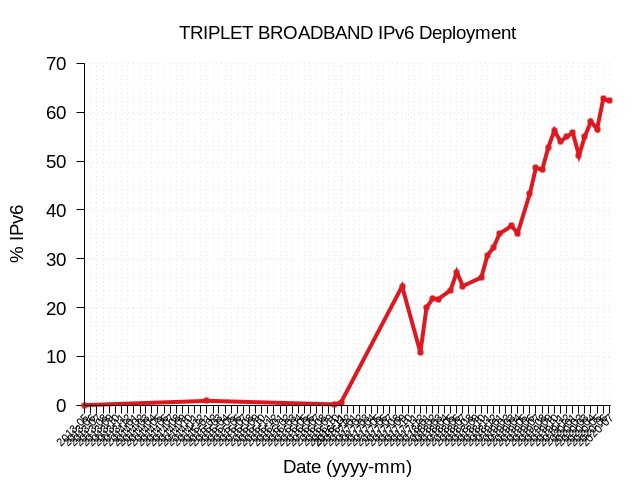 在亚洲,3BB(TRIPLET BROADBAND)是泰国最大的固定宽带服务提供商之一,拥有超过300万宽带用户。早在2010年3BB就开始了IPv6网络升级计划,在2016中期网络达到预期效果后开始向客户提供IPv6。