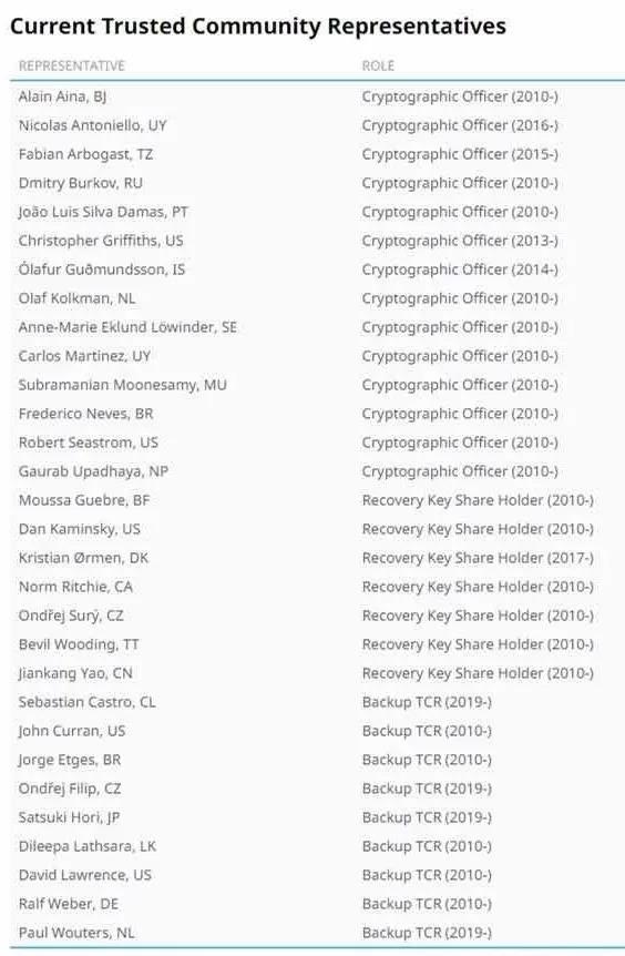 从互联网数字分配机构IANA的网站上查到,当前TCRs已从2010年的21位更新至30位,但据介绍,真正持有密钥的是21位,其他9位作为备选密钥持有人。TCRs也有自己的更新机制,比如早期互联网共同发明人Vint Cerf博士就是其中一位TCRs,参与多次密钥生成仪式,后来因时间问题,即不能保证出席足够的签署仪式而退出,从备选TCRs中进行替补。